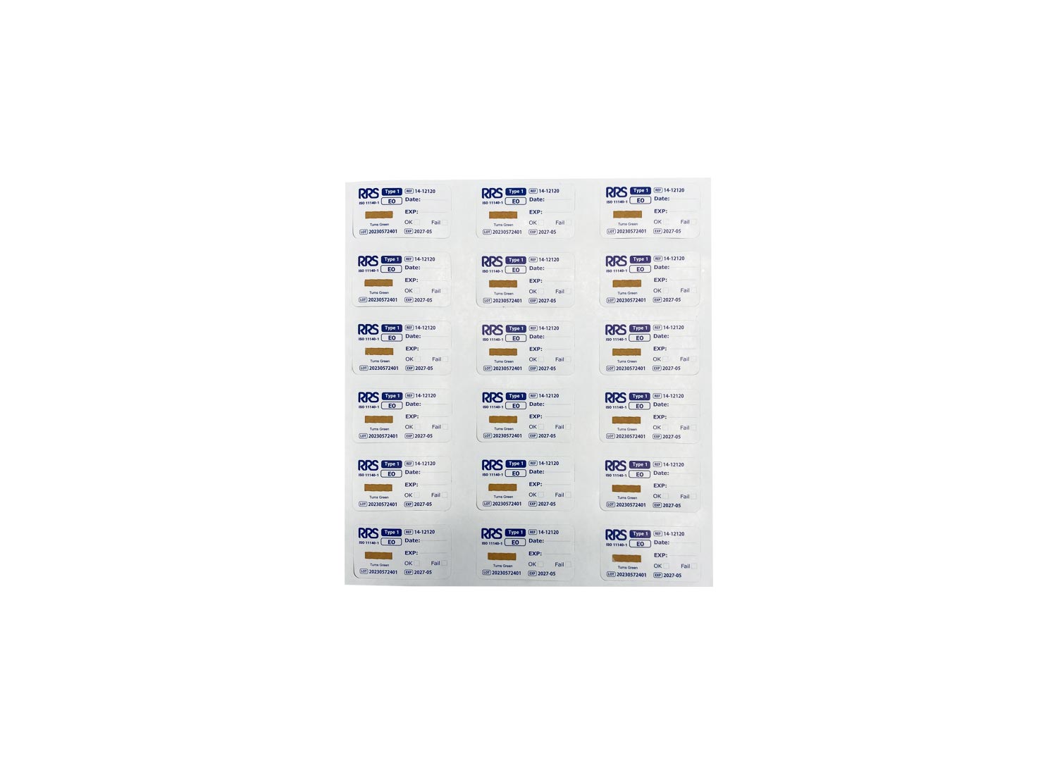 اندیکاتور لیبل کلاس یک اتیلن اکساید EO برند RRS ساخت ایران می باشد که جهت برچسب گذاری کارتن ها و بسته بندی های کوچک تر در فرایند استریل با گاز EO استفاده می شود. این نشانگر دارای جوهر کلاس یک حساس به اتیلن اکساید بوده که در مواجهه با آن تغییر رنگ می دهد. لیبل گذاری کارتن و بسته ها با استفاده از این محصول جهت تفکیک بسته هایی که فرایند استریل رو طی کرده اند از بسته هایی که وارد پروسه استریل نشده اند می باشد.